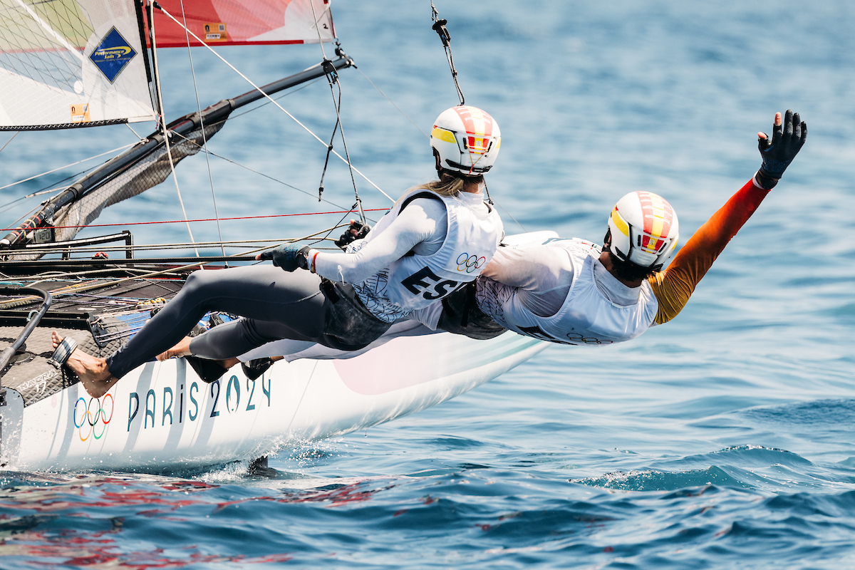 Jordi Xammar y Nora Brugman confían en sus posibilidades y en su buen hacer, demostrado hoy, una vez más, en el campo de regatas. En la primera regata, los españoles llegaban cuartos a la primera marca, tras la que se autopenalizaban por tocar la baliza. El tiempo invertido en esa vuelta sobre sí mismos se traducía en un sexto puesto en el siguiente paso de boya, para dar comienzo a una recuperación que les llevaría a un quinto tras la ceñida y a apretar el acelerador en la popa para cruzar la línea de llegada en tercera posición. Eso sí, todo a la velocidad que imprimía el viento, despacio pero con seguridad.